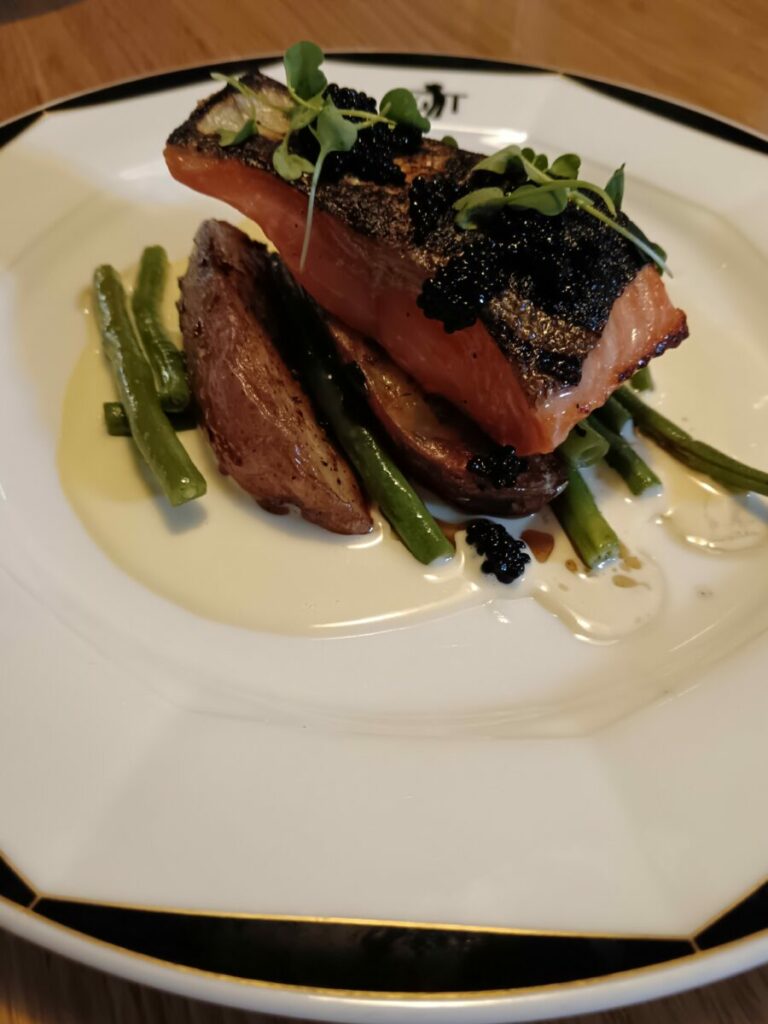 • Лосось на гриле с картофелем по-домашнему, стручками тушеной молодой фасоли и лимонным соусом «Бер блан».