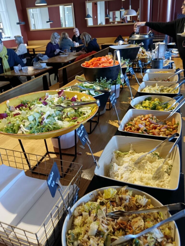 Обед включает в себя большой выбор в салат-баре, хлеб, испеченный в музейном бистро, и небольшой десерт дня. Полноценный обед «шведский стол» с горячим блюдом оценен в меню в 15,70 €, вариант «Суп и салат» составит 12,10 €, салат-бар и блюдо недели от шеф-повара составит 15,90 €. При предъявлении музейной карты посетителю ланч и кофе обойдется в 12,50 €.