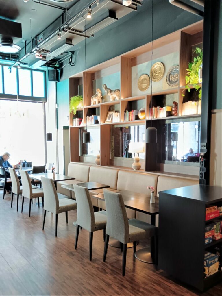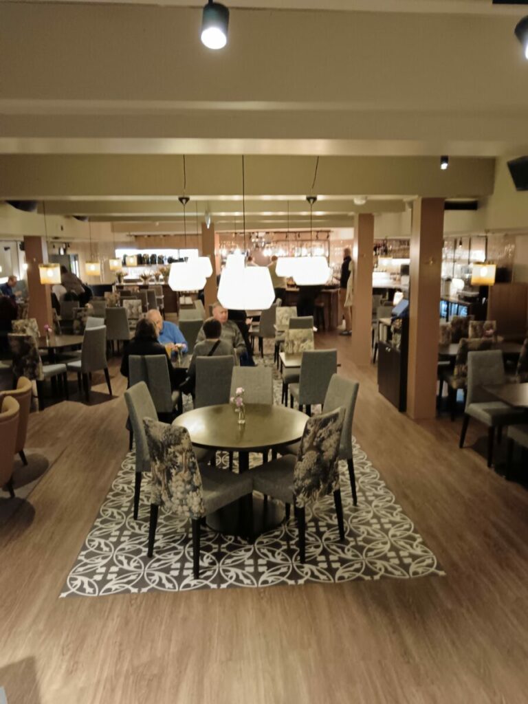 В просторном помещении поместилось около двадцати столиков. Большинство из них рассчитано на четыре персоны, но есть столики и на шесть персон, и столы на двоих. Над столами опущены  светильники, которые дают достаточно много света взамен дневного света из окон, и вместе с тем скрывают тот факт, что потолки в зале не так уж и высоки.