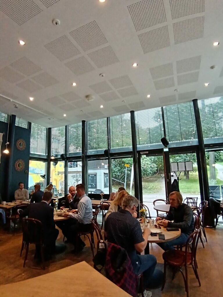 В это посещение мне показалось, что обеденный зал ресторана стал меньше, хотя здание павильона не изменилось. Панорамные окна заведения все так же смотрят на аллеи парка, все те же десяток столиков размещены в основном вдоль окон, а салатный стол по-прежнему размещен центре зала. Возможно, такое впечатление сложилось потому, что он посетил ресторан в час пик, в разгар ланча, и все столики были заняты. Вновь приходящим посетителям приходилось ждать, но далеко не все посетители стремились покинуть заведение сразу после обеда, несмотря на общий шум зала и недовольные взгляды посетителей, ожидающих своей очереди.