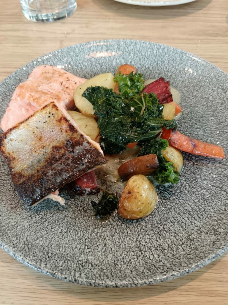 Выбор автора пал на блюдо «Жареная радужная форель с тушеными осенними овощами». Рыба и в этот раз была приготовлена поваром ресторана безупречно.
