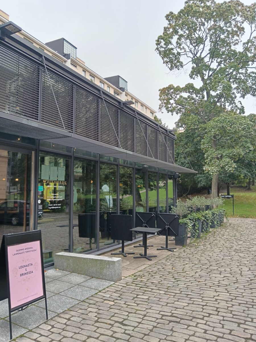 Ресторан Southpark, о котором пойдет речь в этом обзоре, находится на краю парка Синебрюхова, в паре шагов от входа в него, по адресу Sinebrychoffin puisto, Bulevardi 40.