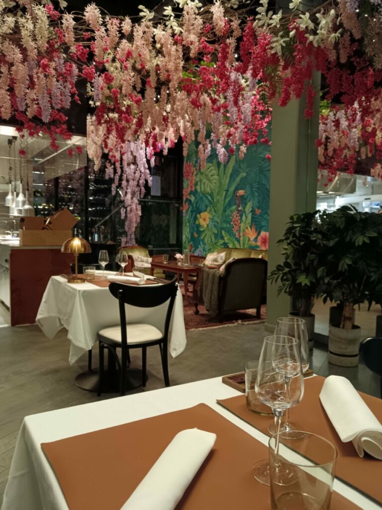 Терраса заведения и малый зал ресторана, так называемая гостиная, обильно украшены растениями. Действительно создается впечатление, что вы обедаете или ужинаете в саду. Открытое окно кухни не портит впечатление. И хотя в малом зале всего восемь столиков, зеркала в на стенах зрительно увеличивают пространство обеденного зала и небольшой лаунж-зоны у лестницы, ведущей еще в два других зала ресторана.