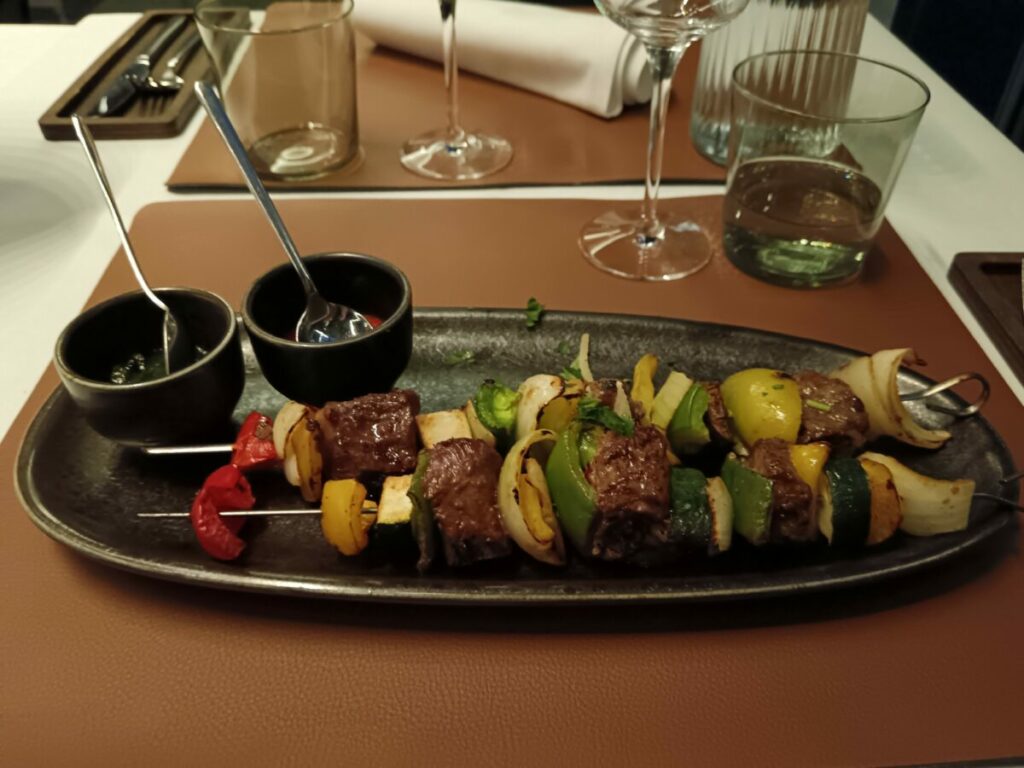 Ваш автор решил попробовать шашлыки из говядины и не ошибся с выбором. Блюдо было приготовлено безупречно. Вот только соус чили он решил не пробовать, а ограничился мятным соусом, что не помешало в полной мере ощутить вкусовые качества мяса.