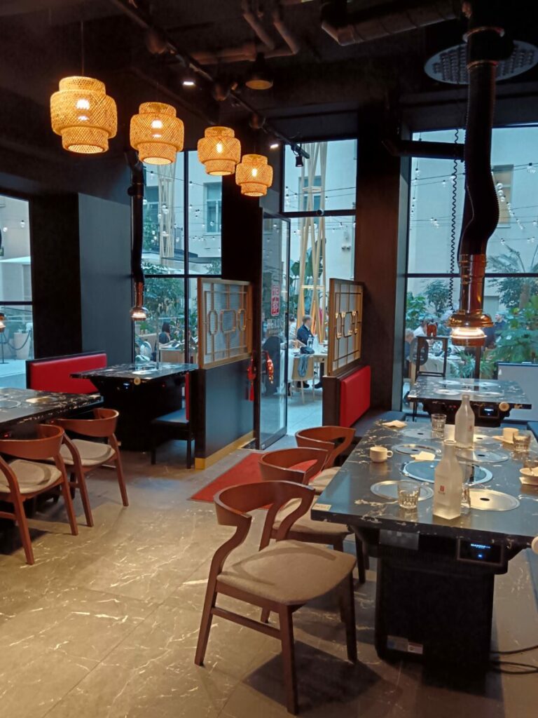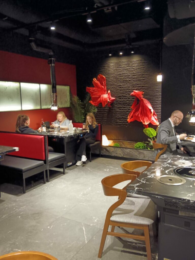 Три небольших обеденных зала слева и справа от бара вмещают каждый по четыре стола на четыре или шесть персон, все столы оборудованы жарочной панелью в центре столешницы.