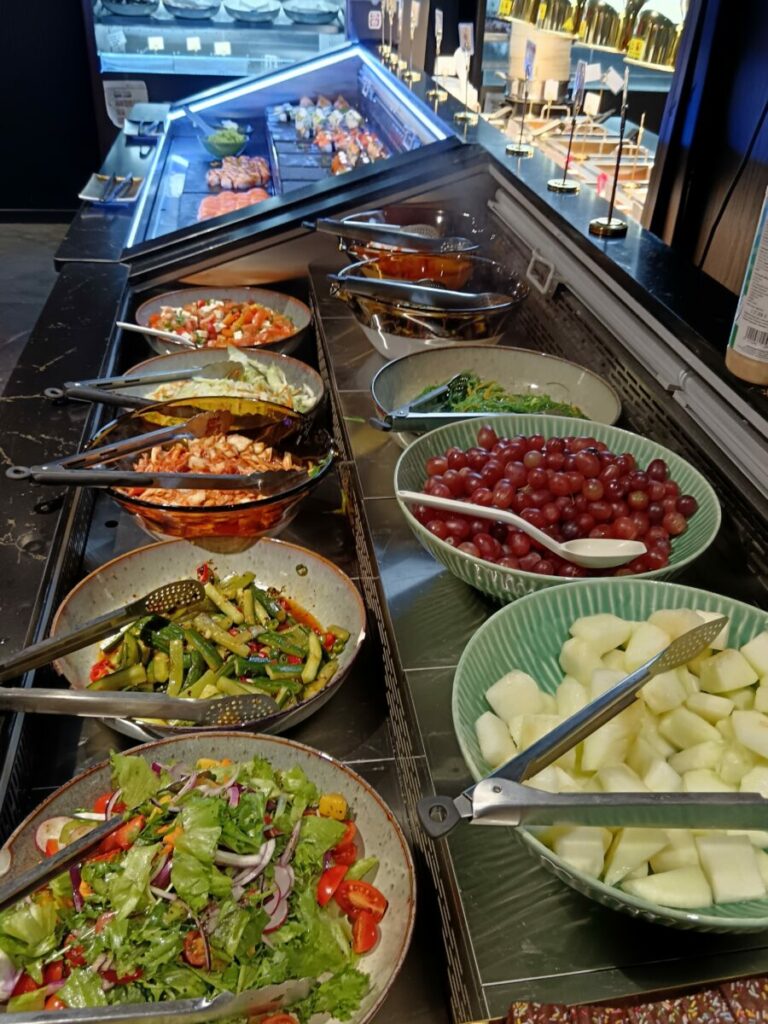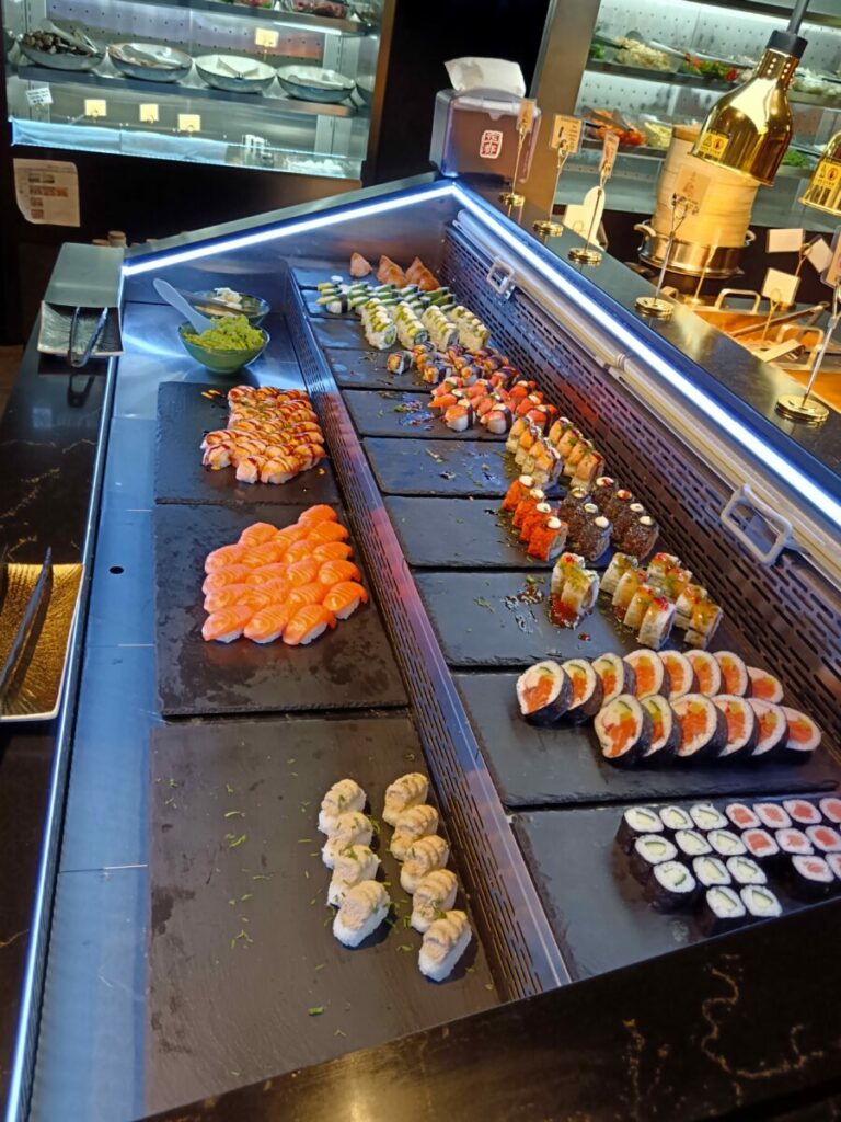 Оплатив заказ в баре, посетитель к «шведскому столу» может сразу приступить к выбору блюд. Перед ним открывается аппетитный выбор салатов и закусок, а рядом большая витрина предлагает неплохой выбор суши и роллов.