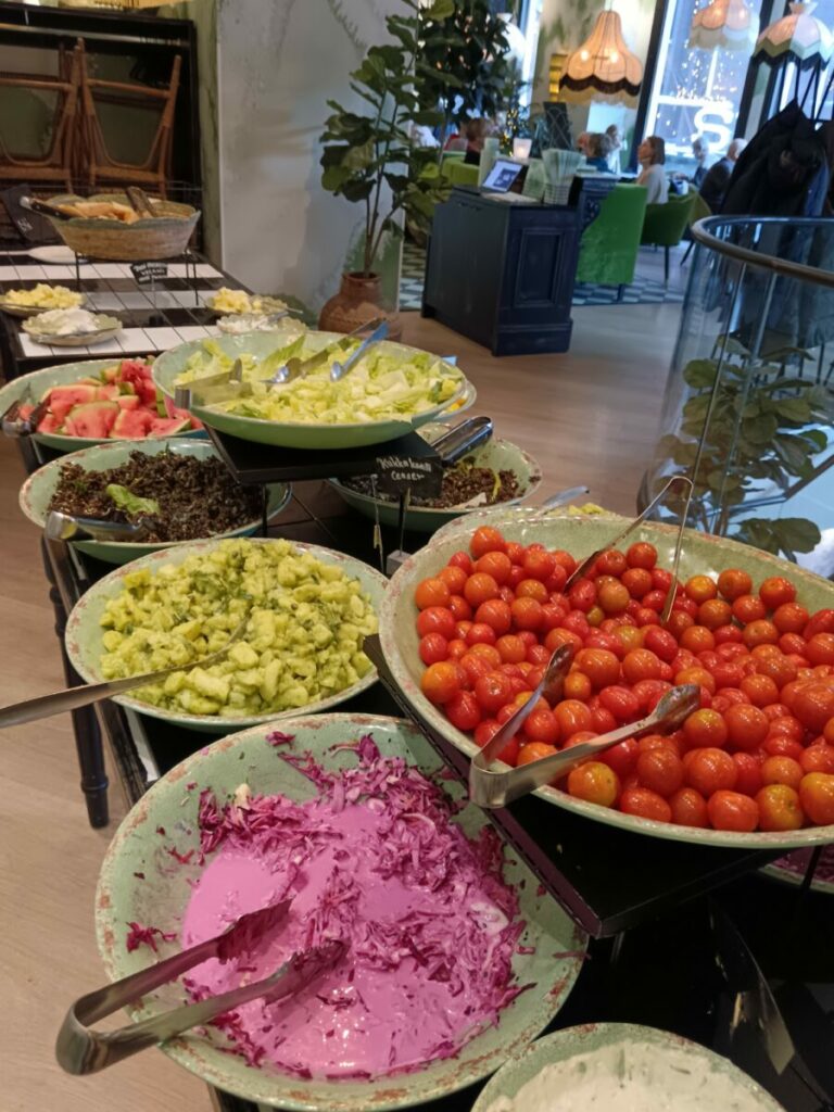 Салатный стол ланча расположился в малом зале у стены, рядом с окном открытой кухни. В день моего посещения он предлагал с десяток наименований. Среди них:
