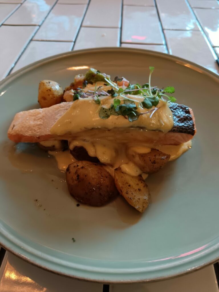 • Жареный лосось с голландским соусом, картофелем с песто и сальсой из помидоров и авокадо.